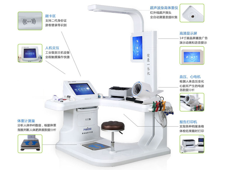 人性化设计、一体化操作、灵活移动检测,支持刷二代身份证、自动建立居民健康档案,即时打印体检报告、强大拓展功能。